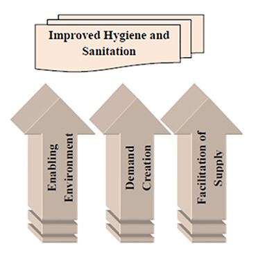 Figure 5.1 depicts that the intended result of nationwide improved hygiene and sanitation can only happen if all three pillars are in place. If one of the pillars is neglected and efforts are inclined towards one or both of the others, it will ultimately end in failure. You can imagine this by its resemblance to house construction. It is common sense that, to build a durable house, you need strong pillars on which the whole structure will rest. The durability and reliability of the house is guaranteed not only by the strength of the pillars but also by their number. All the required number of pillars appropriate to the size of the house should be erected without any compromise, otherwise the house may not provide long service or may collapse immediately before it is finished.