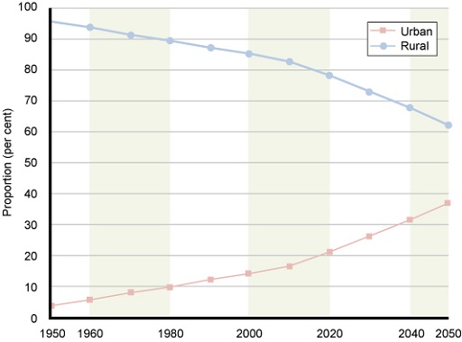 Ethiopia is predominantly a rural country with only 18% of the total population currently residing in urban areas. However, recent trends in urban population growth show how this figure is rapidly changing. It is estimated that the urban population will be 30% of the total by the year 2040 (Figure 6.7).
