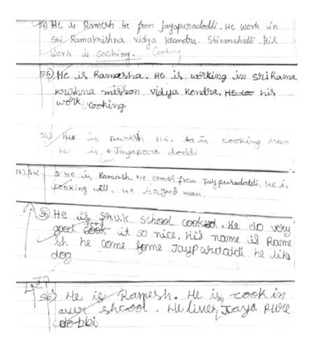 फिर मैंने उनसे कहा कि वे अपने स्वयं के वाक्य अपनी कॉपियों में लिखें [चित्र 1]। इन मसौदों (ड्राफ्ट) से, छात्रों ने रमेश के व्यक्तित्व का वर्णन किया।