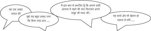 जब हमारी प्रशंसा की जाती है और हमें प्रोत्साहित किया जाता है तो आमतौर पर हम उस समय के मुकाबले बेहतर महसूस करते हैं, जब हमारी आलोचना की जाती है या हमारी गलती सुधारी जाती है। सुदृढ़ीकरण और सकारात्मक भाषा समूची कक्षा और सभी उम्र के व्यक्तियों के लिए प्रेरणादायक होती है। याद रखें कि प्रशंसा विशिष्ट और कार्य पर आधारित होनी चाहिए, किसी बच्चे पर आधारित नहीं, अन्यथा इससे बच्चों को प्रगति में मदद नहीं मिलेगी जैसे : ‘बहुत बढ़िया’ सटीक टिप्पणी नहीं है, इसलिए निम्नलिखित में से कुछ कहना बेहतर होगा: