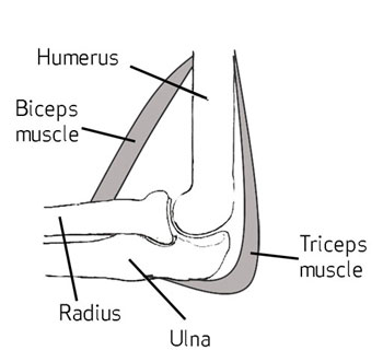 कुहनी की संधि (चित्र R1.1) पर से हमारी अग्रबाहु ऊपर या नीचे की ओर गति कर सकती है। इसका नियंत्रण ऊपरिबाहु पर दो पेशियों द्वारा किया जाता है: आगे से द्विशिरस्क (बाइसेप्स) और पीछे से त्रिशिरस्क (ट्राइसेप्स)। द्विशिरस्क और त्रिशिरस्क प्रतिभावी पेशियां हैं।