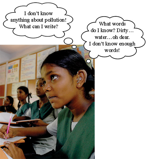 प्रदूषण जैसे विषय के साथ, छात्रों को हो सकता है अधिक पता न हो – और यदि हो भी तो, हो सकता है कि उनके पास उसके बारे में अंग्रेजी में लिख सकने के लिए भाषा कौशल न हों। इसका मतलब है उन्हें एक या दो पंक्तियों से अधिक लिखने में कठिनाई हो सकती है।