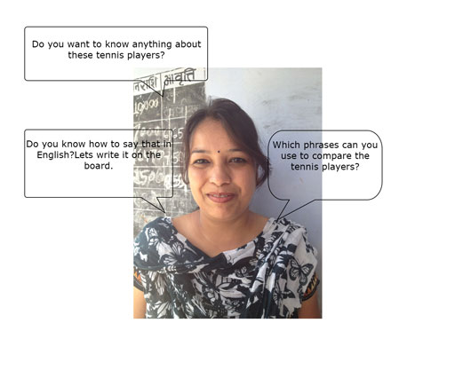 जब छात्र अपने विचारों पर एक दूसरे के साथ, और मेरे साथ चर्चा कर रहे थे उस समय में तब कक्षा रोमांचित है। उन्होंने नए शब्दों को ढूढ़ने के लिए कक्षा के शब्द कोष को भी देखा। जब वे काम कर रहे थे उस समय मैं, यह देखते हुए कि क्या हो रहा था और जरूरत होने पर छात्रों की मदद करते हुए कक्षा में घूम रही थी। मैंने छात्रों को अपनी चर्चाओं में अंग्रेजी का उपयोग करने के लिए भी प्रोत्साहित किया, जिसके लिए मैं स्वयं उनसे यथासंभव अंग्रेजी में बात कर रही थी।