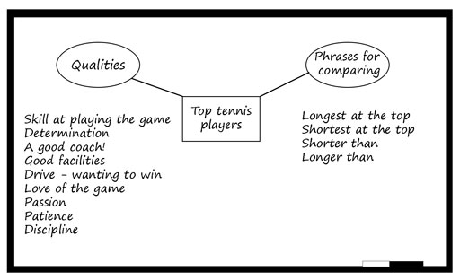 मेरे छात्रों द्वारा निर्देशों को पढ़ लेने के बाद, मैंने उनसे कुछ प्रश्न पूछे ताकि सफल टेनिस खिलाड़ियों के गुणों के बारे में कुछ विचार बने आरै लेखन कार्य के लिए कुछ भाषा बन सके।