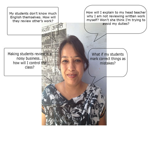 मैंने अपने छात्रों से कहा कि यदि वे चाहें हो तो वे अपनी स्थानीय भाषा में बोल सकते हैं, और जब वे शब्दों और अभिव्यक्तियों के सुझाव दे रहे थे, मैं उन्हें बोर्ड पर अंग्रेजी में लिखती गई। कुछ छात्रों ने अंग्रेजी में सुझाव दिए, और उन्होंने प्रायः गलतियाँ कीं; उदाहरण के लिए एक छात्र ने shorter than के स्थान पर shorter to कहा। तथापि, मैंने उसकी गलती नहीं सुधारी – मैंने बस उसे अंग्रेजी में सही तरह से कहा और सही स्वरूप को बोर्ड पर लिखा। सबसे महत्वपूर्ण बात थी विचार लेना, और यदि मैं हर किसी को बोलते समय सही करती, तो वे निरुत्साहित हो सकते थे।