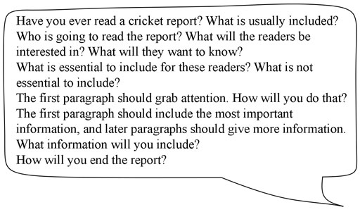 यह महत्वपूर्ण है कि लिखना शुरू करने से पहले छात्र अलग अलग पाठ्यवस्तुओं की संरचनाओं से परिचित हों – आप उन्हें अलग अलग पाठ्यवस्तुओं के उदाहरण और मॉडल दिखा सकते हैं (देखें इकाई ‘अग्रेजी में स्वतंत्र लेखन में सहायता करना’ )। यदि आप अलग अलग पाठों की विशेषताओं की चर्चा करने के लिए इन उदाहरणों का उपयोग करते हैं तो छात्रों को लिखने में सहायता मिलती है। चर्चा के मुख्य बिंदुओं में निम्नलिखित शामिल हो सकते हैं: