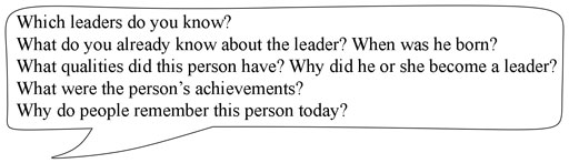 शीर्षक के बारे में विचार देने के लिए कुछ प्रश्न पूछें। अलग अलग छात्रों को अपने विचार देने के लिए प्रोत्साहित करें। यदि आपके छात्रों को अंग्रेजी में सोचने में कठिनाई हो रही है, तो उन्हें किसी अन्य भाषा का उपयोग करने दें और फिर अन्य छात्रों से उसका अनुवाद करने को कहें। जब वे विचार दें रहे हों, तब उन्हें बोर्ड पर लिखें। यदि उन्हें कठिनाई हो रही हो, तो आप कुछ संकेत देने वाले प्रश्न पछू सकते हैं – लेकिन केवल अंतिम कोशिश के रूप में ही, क्योंकि विचारमंथन का मतलब छात्रों के विचारों का मूल्याकंन करना और उन्हें एकत्र करना ।‘My favourite leader’ के कुछ उदाहरण प्रश्न ये हो सकते हैं: