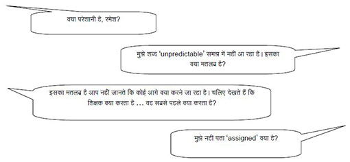 मैं यह देखने के लिए अधिक प्रयास करने लगा कि कक्षा का हर विद्यार्थी कैसे काम कर रहा है। आपको मैं एक उदाहरण देता हूँ। हाल ही में, मेरे छात्र जोड़ियों में कुछ बोध प्रश्नों के उत्तर लिख रहे थे [संसाधन 3 की गतिविधि देखें]। जब वे अपने उत्तरों पर चर्चा करने और लिखने लगे, तो मैं एक जोड़ी के पास गया और उनकी चर्चा को सुनने लगा। ऐसा लगा कि उन्हें उत्तर की अच्छी अवधारणा है, इसलिए मैं दूसरी जोड़ी के पास गया। इस बार, यह स्पष्ट था कि एक छात्र, रमेश को इस प्रश्न के साथ कठिनाई हो रही थी: ‘Anne says teachers are most unpredictable. Is Mr Keesing unpredictable? How?’