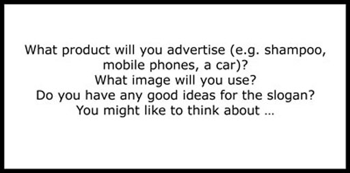 छात्रों को बताएं कि वे अंग्रेजी में स्वयं अपने विज्ञापन की परिकल्पना करने जा रहे हैं। इसमें एक चित्र, एक प्रचार वाक्य और कुछ टेक्स्ट होना चाहिए।