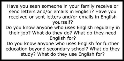 अपने स्थानीय क्षेत्र में अंग्रेजी की भूमिका पर ध्यान दें तो आप देख सकते हैं कि अंग्रेजी विज्ञापनों, संदेशों, गीतों और टीवी पर पायी जा सकती है। आप अंग्रेजी के इन स्थानीय संसाधनों का उपयोग अपनी कक्षा में कर सकते हैं। छात्रों का ध्यान स्थानीय क्षेत्र में प्रयुक्त अंग्रेजी की ओर आकर्षित करके, आप उस असली अंग्रेजी को सीखने में उनकी मदद कर सकते हैं जिसका उपयोग कक्षा के बाहर की वास्तविक दुनिया में किया जाता है। आप यह भी पाएंगे कि जब उन्हें अपने उद्देश्यों की पूर्ति के लिए अंग्रेजी को समझने और प्रयोग कर पाने के फायदे समझ में आने लगते हैं तब वे अंग्रेजी सीखने के लिए और अधिक प्रेरित होते जाते हैं।