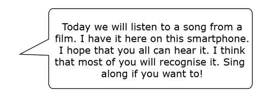 अधिकांश छात्रों को संगीत पसंद होता है और वे अंग्रेजी के गीतों या अंग्रेजी शब्दों से युक्त गीतों को सुनने और उनके साथ गाने का आनंद लेते हैं। आप छात्रों से चर्चा के लिए अगले गीत का चुनाव करने को कह सकते हैं। हो सकता है उनके पास कोई विशेष गीत हो जिसे वे अंग्रेजी में बेहतर ढंग से समझना चाहते हों। आप गीतों के अंग्रेजी शब्दों को स्थानीय भाषाओं में अनुवाद करने, या स्थानीय गीतों को अंग्रेजी में अनुवाद करने का प्रयास कर सकते हैं। आपकी कक्षाओं में गीतों का उपयोग करने के लिए अन्य विचार संसाधन 3 में हैं।