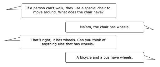 - किसी चित्र या वास्तविक वस्तु का उपयोग करना: आप बोर्ड पर व्हीलचेयर का चित्र बना सकते हैं, पाठ्यपुस्तक में दिए गए चित्र का उपयोग कर सकते हैं या किसी पत्रिका या अखबार से चित्र काट कर निकाल सकते हैं।