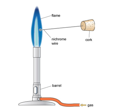 Figure: Components of a Bunsen burner and position of the nichrome wire for flame tests.