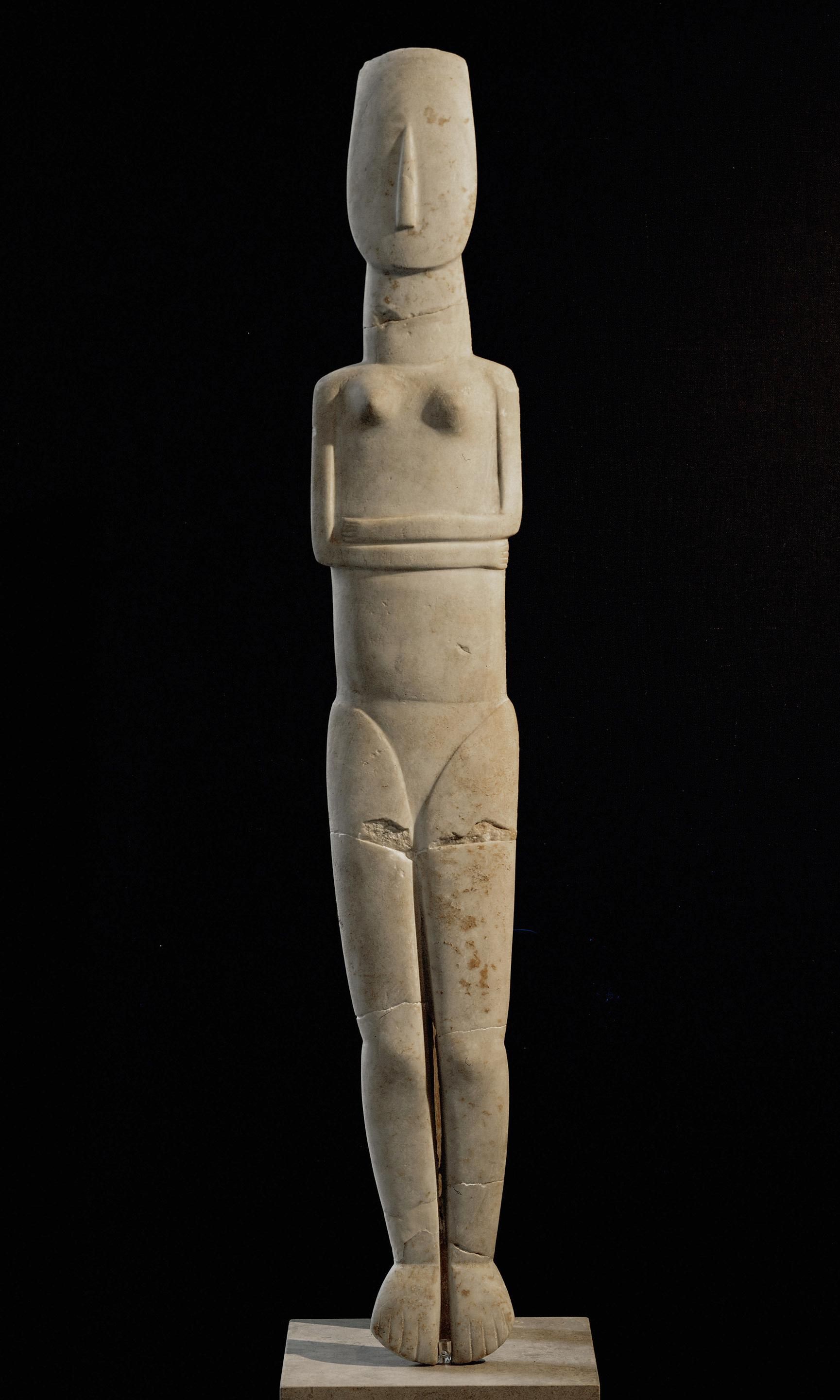 They present a particular configuration that remembers the angle and abstract figures of the primitive sculpture: the body flattened and cuniform, the stong neck in the shape of a column, the oval face reduced to a big nose. Within this narrowly defined and stable type, Cycladic idols have very variable shapes and sizes, from a few centimetres to full size.