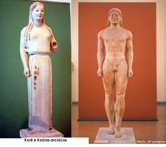 The Greek statues of the archaic period represent both female and male figures being called the Korai female figures that are represented always dressed and the kouroi male figures always naked.