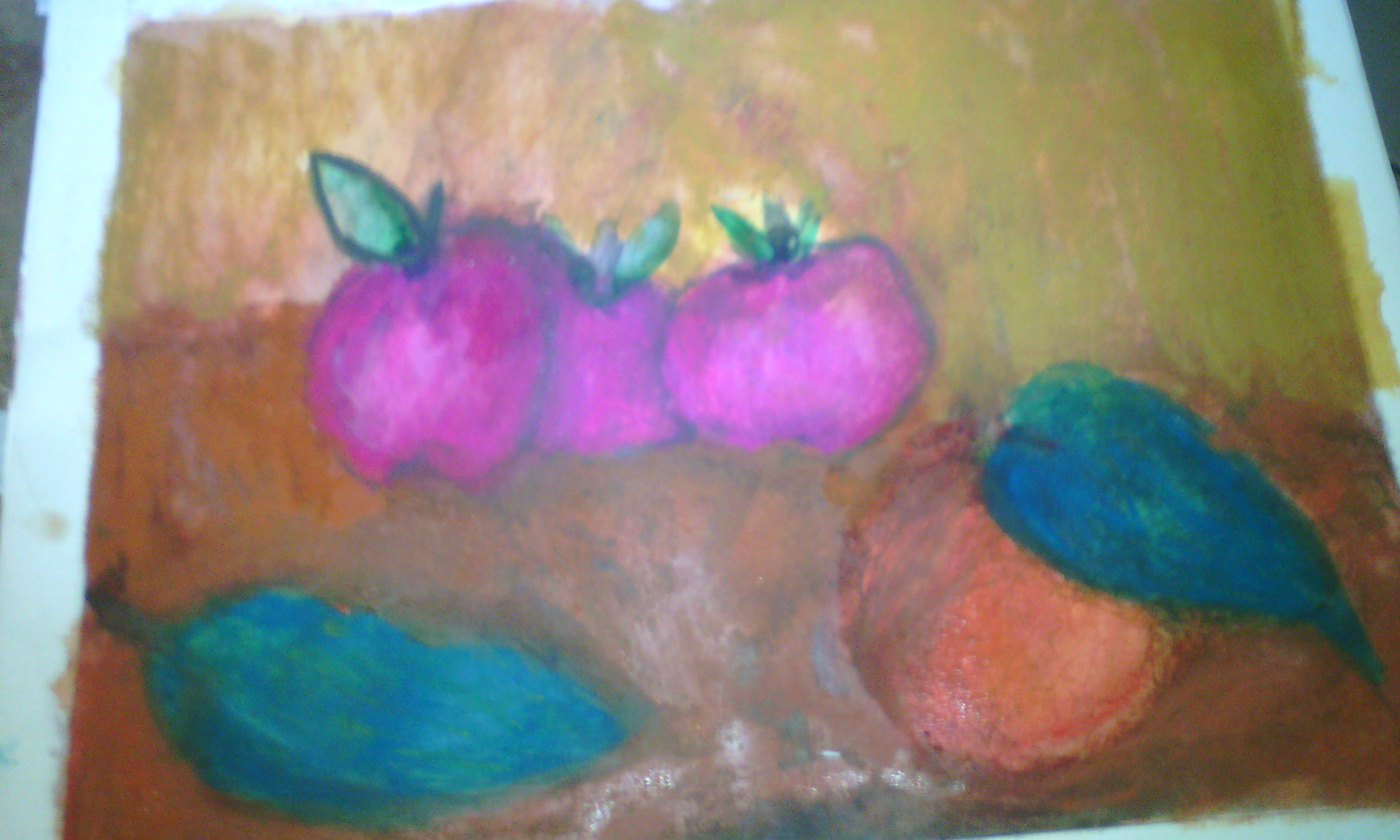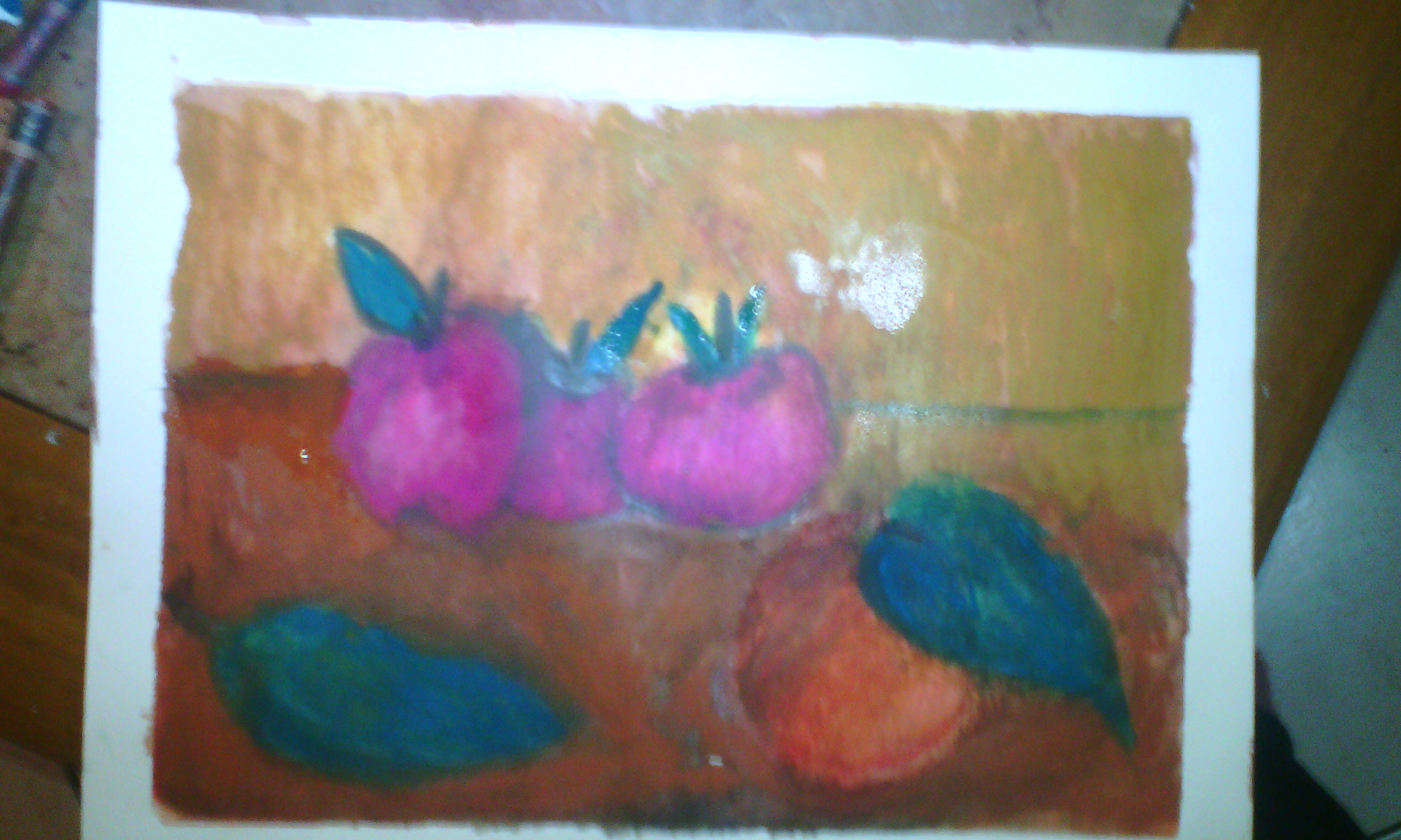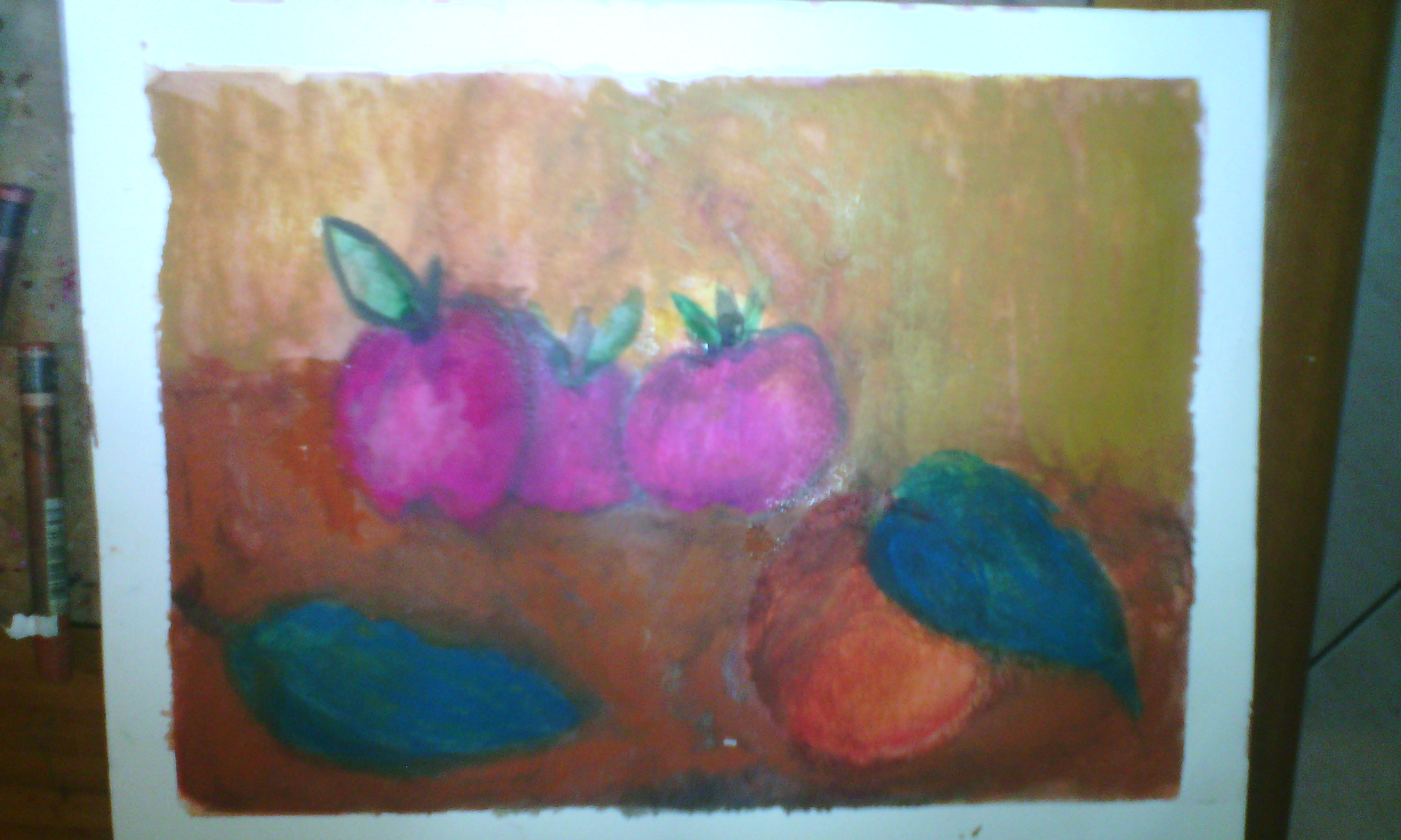 I emphasized the apples so that you can see the effect of water on the pastels.