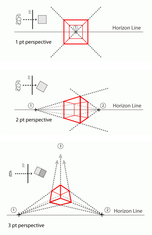 There are three basic types of perspective: one-point, two-point, and three-point. Each type has its particular vanishing point or points.
