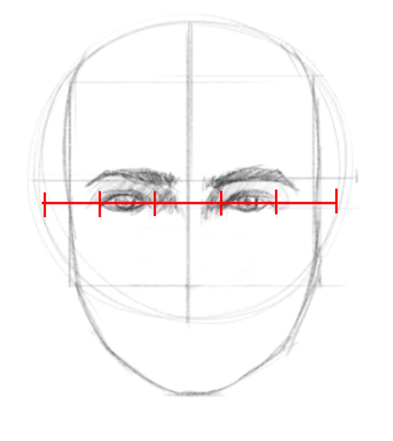 To do this, divide the head into equal vertical parts. The width of the head, excluding the ears, is approximately ten eyes wide. Therefore, each of the ten divisions is equal to the width of one eye.