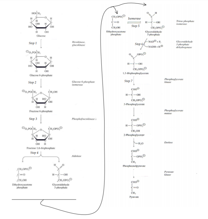 d) The enzyme triose phosphate isomerase, catalyzes step 5. In this step Dihydroxyacetone phosphate is converted into Glyceraldehyde-3-phosphate (DAP ←→G3P). Glyceraldehyde-3-phosphate (G3P) is immediately used in step 6. Dihydroxyacetone phosphate must be converted to Glyceraldehyde-3-phosphate (G3P) before it can continue through glycolysis. Cells lacking triose phosphate isomerase can’t convert (DAP←→G3P). These cells can remain alive but only under aerobic conditions. Explain why cells lacking triose phosphate isomerase are alive only under aerobic conditions.