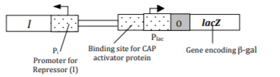 You design a summer class where you recreate experiments studying the lac operon in E. coli (see schematic below). In your experiments, the activity of the enzyme b-galactosidase (β -gal) is measured by including X-gal and IPTG in the growth media. X-gal is a lactose analog that turns blue when metabolised by b-gal, but it does not induce the lac operon. IPTG is an inducer of the lac operon but is not metabolized by b-gal.