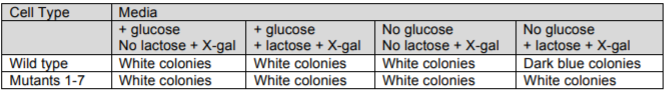 After mutagenesis you find 7 mutants that never turn blue as shown in the table below. *Note each mutant has a single loss-of-function mutation.