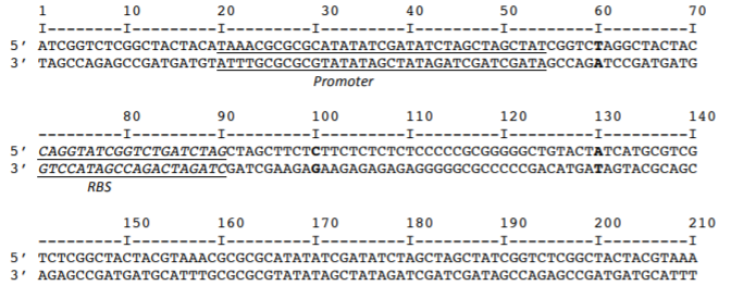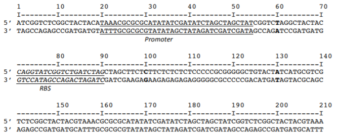 This is the same sequence as shown on the previous page. It is repeated for your convenience. Below are 210 consecutive base pairs of DNA that includes only the beginning of the sequence of gene X. The underlined sequence (from position 20-54) represents the promoter for gene X and the underlined and italicized sequence (from position 71-90) encodes the gene X ribosome binding (RBS) site. Transcription begins at and includes the T/A base pair at position 60 (bold)