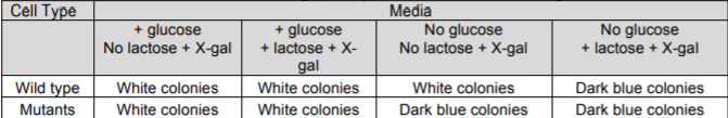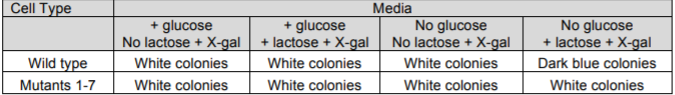 After mutagenesis you find 7 mutants that never turn blue as shown in the table below. Each mutant has a single loss-of-function mutation.