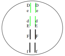 The genotype of the cell above is DdEeFf, where the D and E loci are on the large chromosome and the F locus is on the small chromosome. This cell was taken from an F1 organism that resulted from the cross of two true breeding parents of the following genotypes.