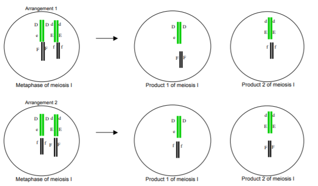 i) Draw the two possible arrangements of chromosomes as they could appear in metaphase of meiosis I. Include the D, d, E, e, F, and f alleles on the drawing and assume no recombination.