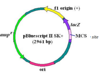 b) You choose the vector pBlue, shown below. Note that the cloning site lies within lacZ, the coding region of the gene that encodes β-galactosidase. A cell that expresses β-galactosidase can take a substrate called X-gal and cleave the β-1,6 linkage to form a product that is bright blue. For each of the following sequences found on pBlue, list the step or steps (1-7 above) for which that sequence is needed and explain the role that sequence plays.