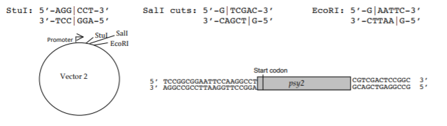 You successfully amplify the psy2 coding sequence (repeated below for you) and plan to clone the PCR fragment into vector 2. The cloning sites available on this vector are shown below.