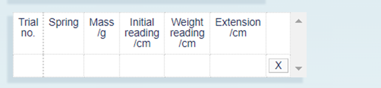 You will use this to record the data generated by the spring mass system. The initial reading is the length of the spring in centimetres at rest before any weights are added to the spring.