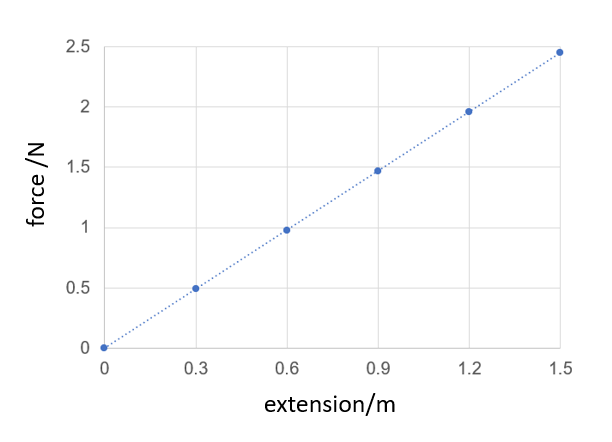 The normal convention when plotting data is to plot the dependent variable on the y-axis and the independent variable on the x-axis. However, because the spring force constant is expressed as N/m, this convention is reversed when applying Hooke’s law, such that the dependent variable (extension, m) is now plotted on the x-axis and the independent variable (force, N) on the y-axis and hence, the resulting slope is expressed as N/m.