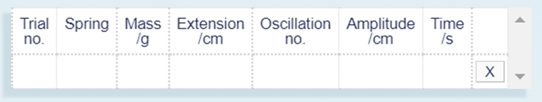 Figure 5 The table headings used for the investigation of simple harmonic oscillations using the spring mass system application.