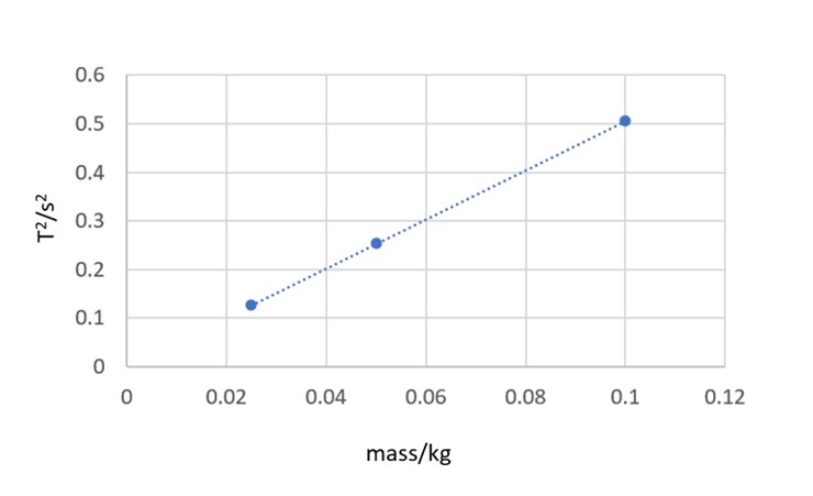 The observations in Table 3 can be used to calculate the spring force constant. This is done by plotting the square of the period against mass and using the slope of the graph to calculate the force constant. However, before this can be done the data in Table 3 needs to be transformed, so the period is expressed as T2 and the mass in kg (Table 4).