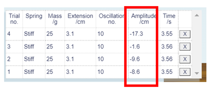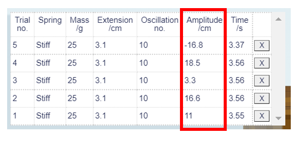 Students were tasked with exploring the relationship between mass, the amplitude used to displace a weighted spring with the period of oscillation using the ‘Simple harmonic oscillation’ experiment accessed via the Spring mass system homepage.