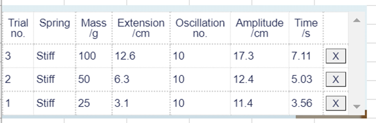 Please note that these data were collected using the ‘10’ oscillation option, meaning that the Time/s column has recorded the time it takes for 10 oscillations to occur (so the period of one oscillation is a tenth of the time shown in the table).
