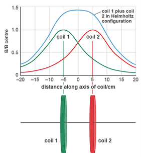 Figure 2 A graph showing the magnetic field strength along the axis of two identical coils aligned coaxially, and separated by a distance equal to their radius of 10 cm. The lower curves represent the field strength due to each coil individually, which each has a peak at the same position as its coil. The magnetic field 5 cm from their combined centre has fallen by less than 5% compared with the value of the field midway between the coils. A combination of two coils in this configuration is known as a Helmholtz pair.
