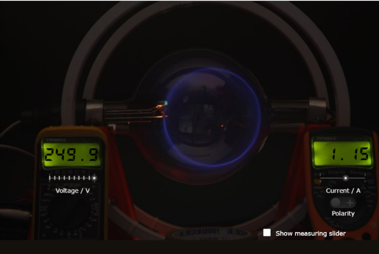 - Start with the accelerating PD = 0 V and increase the PD up to 250 V using the slider on the voltmeter. The polarity switch should be to the left, in the + position. Describe and explain the beam.