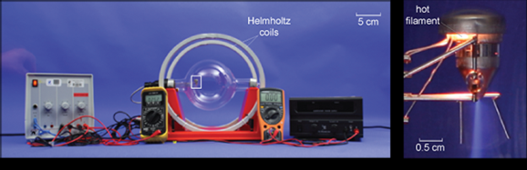 Figure 5 From left to right you can see the power supply used to accelerate the electrons, voltmeter (measures voltage), fine beam tube within the two coils, ammeter (measures current) and power supply to the coils. On the far right you can see a close-up of the lilac beam emerging downwards from the hot cathode (its location within the glass tube is indicated by the white rectangle).