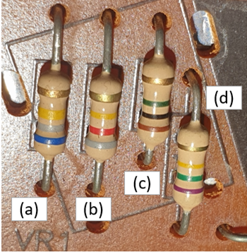 Note down the colour bands for each of the resistors (a) to (d), for example, (a) has blue/grey/yellow bands that are close together and a gold band set apart. You will use this information to identify the resistance values for each of these resistors later in this lesson. |