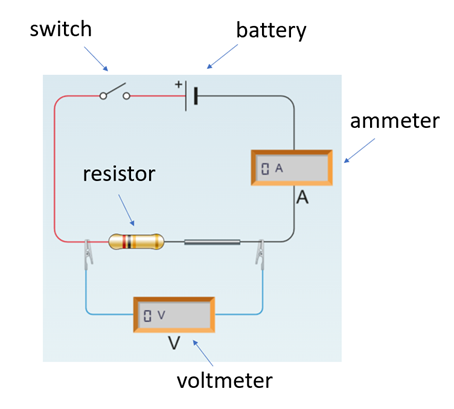 Figure 2 is a representation of a simple electrical circuit consisting of a single resistor and a battery. There is also a voltmeter to measure the voltage across the resistor and an ammeter to measure the current flowing in the circuit (you will notice that the ammeter is ‘in line’ and forms part of the circuit whereas the voltmeter is external to the circuit).