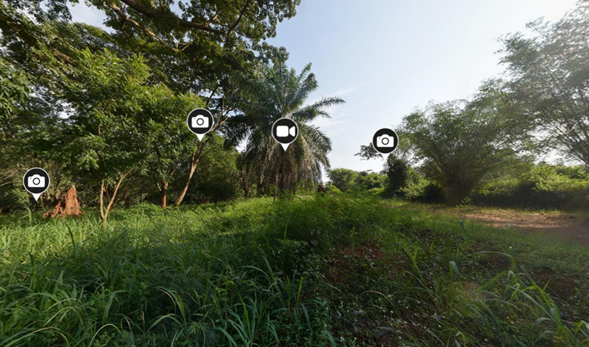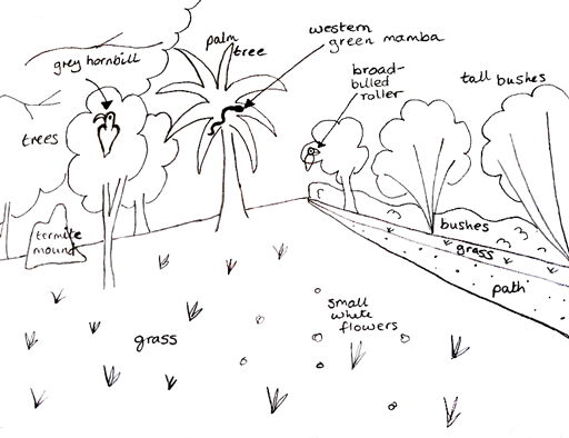 Figure 1. (a) A view of an environment showing different types of vegetation in the Palm tree site panorama in the Legon Botanical Gardens, Ghana. (b) An annotated field sketch of the same view with labels recording relevant information about observations in the environment.