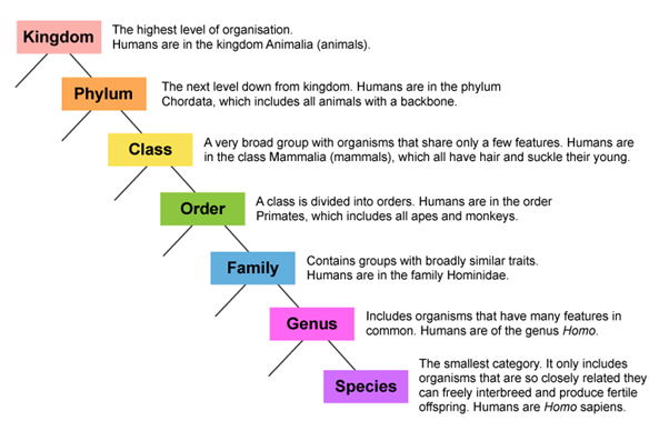 Individual organisms are named and sorted into a hierarchical system. This is intended to reflect evolutionary relationships, like a huge ‘family tree’ stretching back millions of years. The hierarchy of categories is shown in Figure 2.