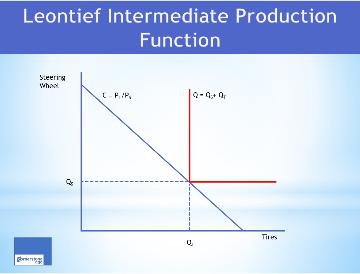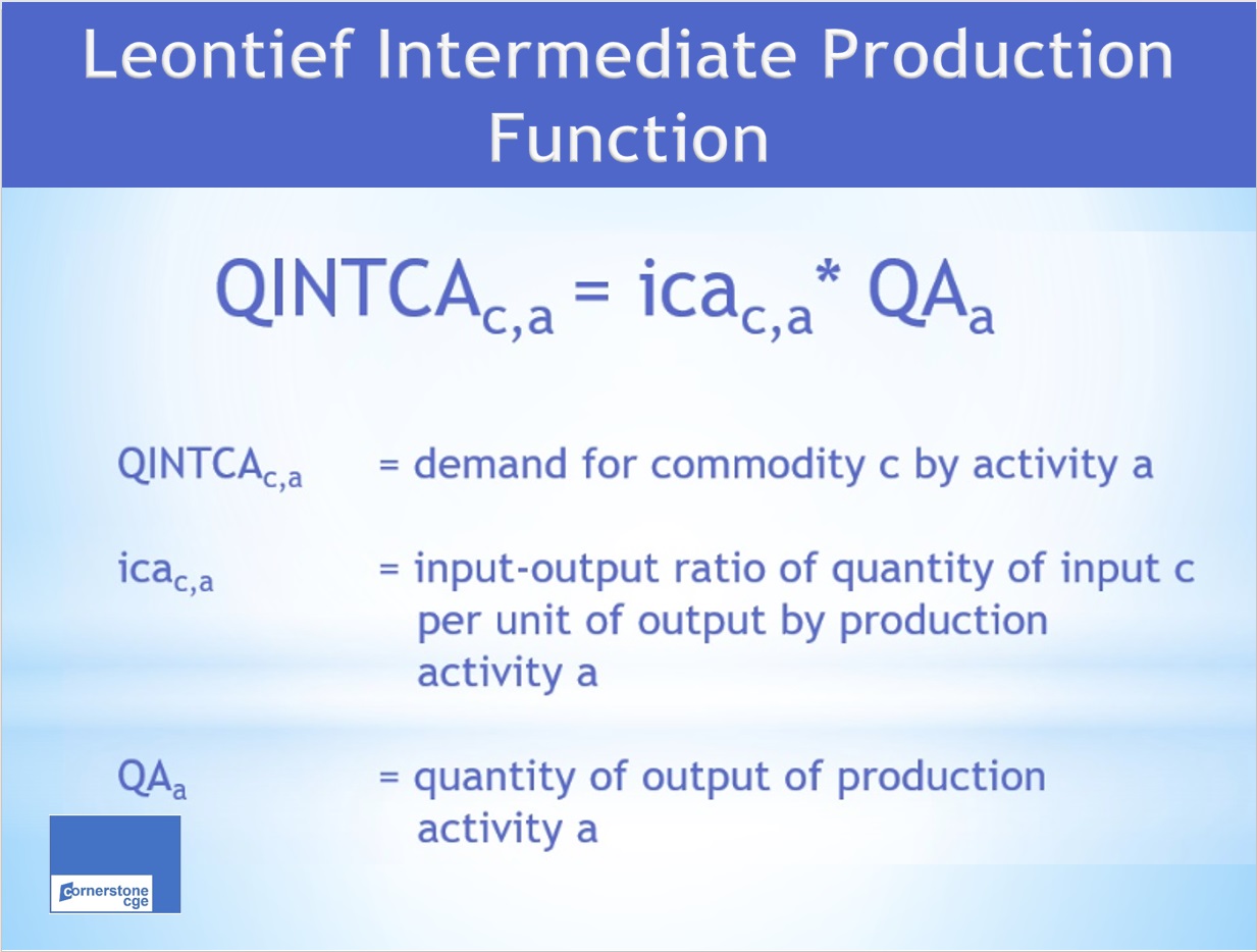 This lesson focuses on the demand for intermediate inputs. In many CGE models, this demand is characterized by fixed input-output relationships between the quantity of intermediate inputs required per unit of output. For example, production of an auto requires a bundle of intermediate inputs that must contain 4 tires and one steering wheel. Adding a fifth tire or a second steering wheel to the input bundle will not increase the number of autos that can be produced. This fixed relationship between the quantity of inputs per unit of output is called a Leontief production function, named after Vassily Leontief, the economist who developed this idea.