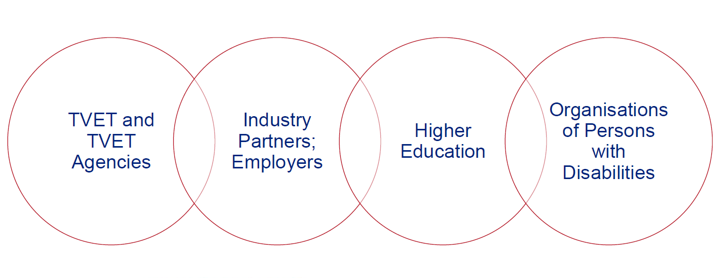 Everyone has a role to play in organisational change that advances gender and social inclusion within an organisation. Some examples of key stakeholders may include TVET organisations, the TVET Agencies, industry partners and employers, Higher Education institutions, Organisations of Persons with Disabilities etc. Collaboration on overlapping roles and /or situations are expected as illustrated in the figure below.