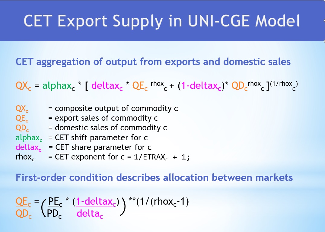 Many producers make commodities that can be either sold in the domestic market or exported to foreign markets. How do they decide which market in which to sell their output? Some CGE models, including the UNI-CGE model, describe this decision using a constant elasticity of transformation (CET) export supply equation. It describes how easily producers can transform their product to be suitable for sale in the export or domestic market.