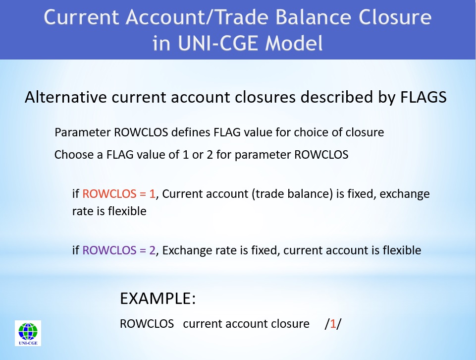 Parameter ROWCLOS is defined with a flag value of 1 or 2 (Figure 3). If you choose a fixed trade balance with a variable exchange rate, set the flag to a value of 1. If you choose a fixed exchange rate regime and a flexible trade balance, set the flag to a value of 2.