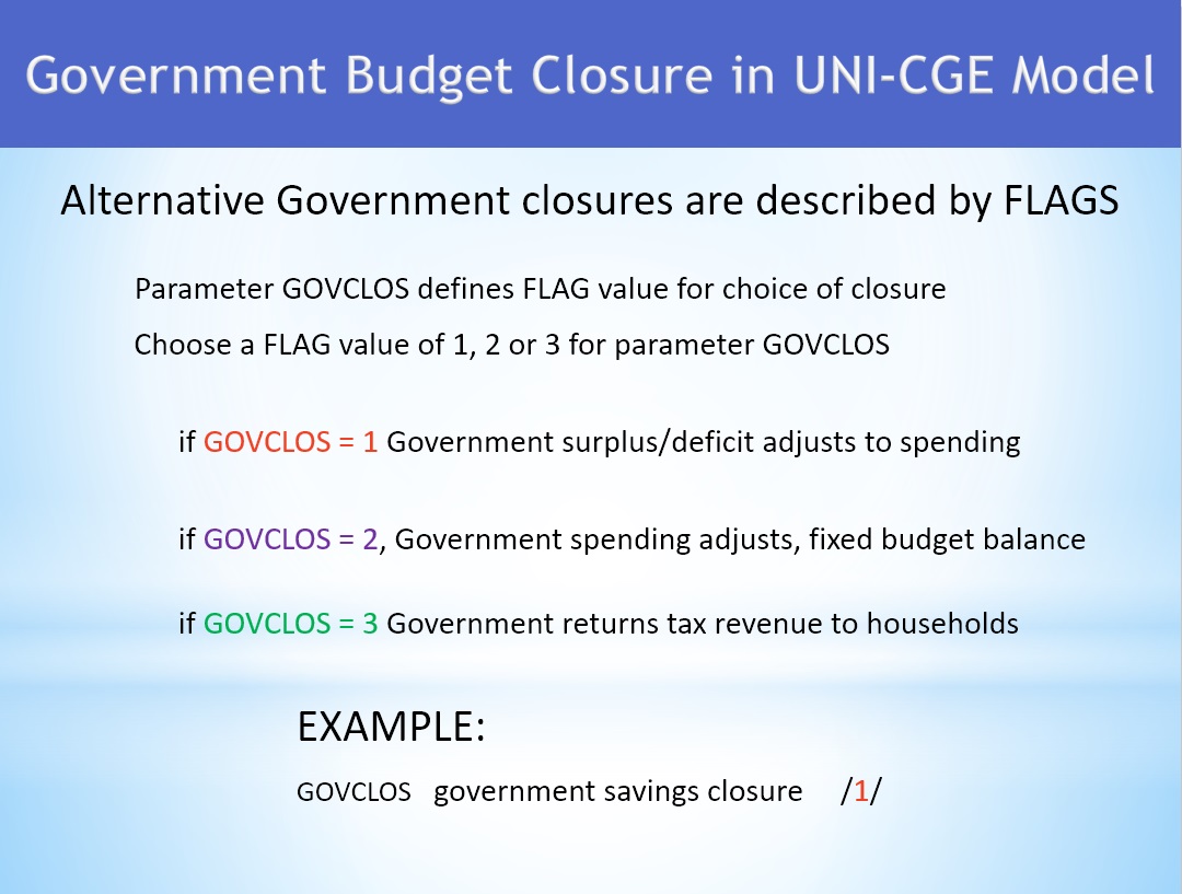 Parameter GOVCLOS (government closure) is defined with a flag value of 1, 2 or 3 (Figure 2). If the government surplus/deficit is allowed to accommodate changes in government income or spending, set the flag to a value of 1. If the budget balance is fixed, and government purchase quantities must adjust when tax revenue or prices change, set the flag to a value of 2. If changes in tax revenue are distributed back to households, set the flag to a value of 3.