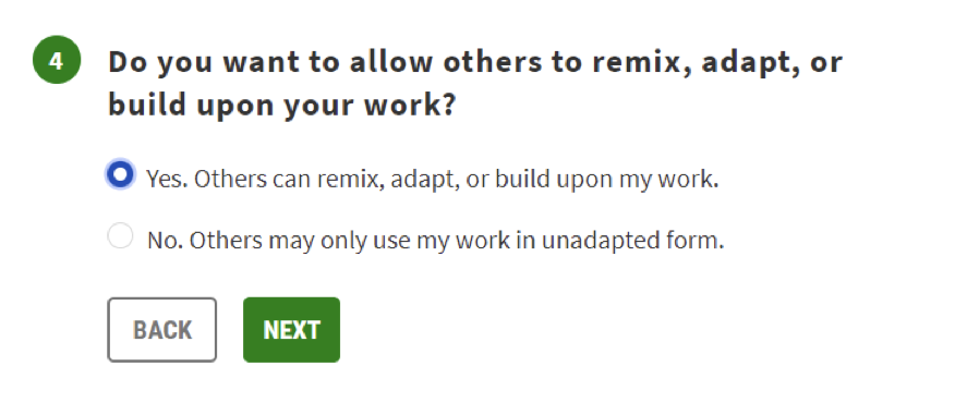If you want to allow others to share adaptations of your work under any license, click YES, otherwise click NO.